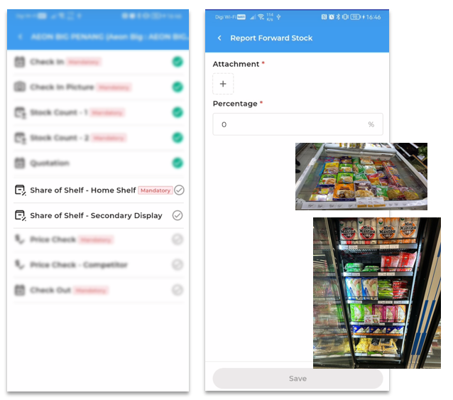 • Share of shelf  - Merchandisers can now capture the share of shelf for both Kawan Food products and competitors' as part of their routine tasks.